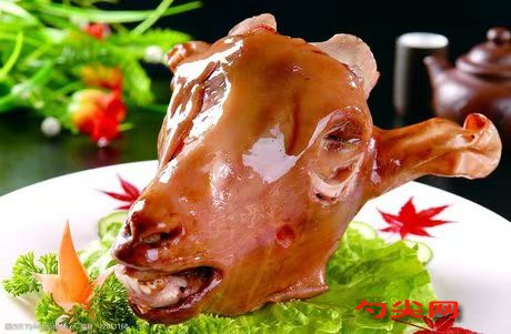 制作方法:(1)山羊頭經褪毛、扒皮、浸泡、搓牙、割耳、汆水工序。(2)放入秘制的鹵水湯內鹵制50分鐘關火,再浸泡30分鐘即成。