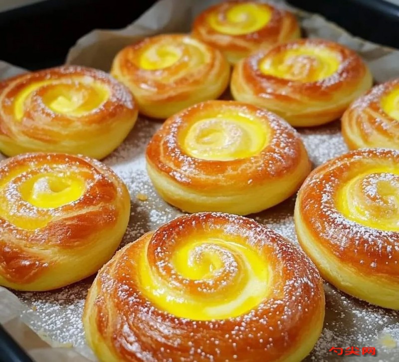 工藝:糕點(diǎn)奶油:在平底鍋中,將牛奶與一半的糖和香草精一起加熱至熱,但不要沸騰。 在碗中,將蛋黃與剩余的糖和玉米淀粉一起攪拌直至充分混合。 將一些熱牛奶倒在蛋黃混合物上,同時(shí)攪拌以調(diào)溫。 然后,將蛋黃混合物與剩余的牛奶一起倒入鍋中。用中火煮,攪拌直至變稠。 從火上移開(kāi),加入黃油并攪拌均勻。用保鮮膜覆蓋奶油(接觸表面)并讓它冷卻。將酵母溶解在少許溫牛奶和一茶匙糖中。讓它靜置直至起泡。 在一個(gè)大碗中,混合面粉、佳多美Q,糖和鹽。加入雞蛋、活性酵母、香草精和剩余的牛奶。揉捏直至充分融合。 在室溫下加入黃油,繼續(xù)揉捏,直至獲得柔軟且有彈性的面團(tuán)。 用布蓋住面團(tuán),放在溫暖的地方放置 1 小時(shí)或直至其尺寸增加一倍。將面團(tuán)放在撒了面粉的表面上搟成 1 厘米厚。 將面團(tuán)切成矩形或橢圓形。 將一部分糕點(diǎn)奶油放在每個(gè)矩形的中心。 將尖端向中心折疊,部分覆蓋奶油。烤:將烤箱預(yù)熱至 180°C。 將發(fā)票放在襯有羊皮紙的托盤上。再靜置 15 分鐘以使其醒發(fā)。 烘烤 15-20 分鐘,或直至金黃色。