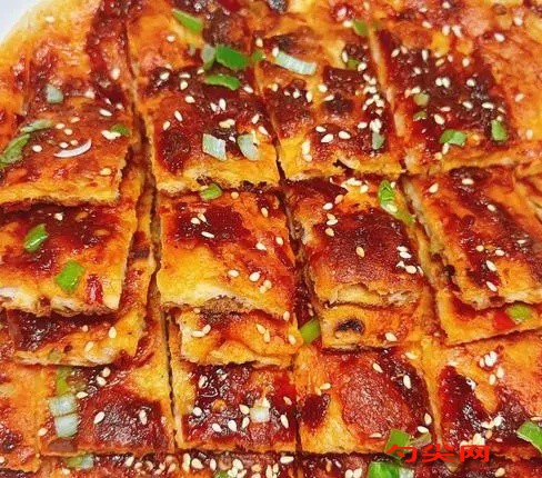 工藝流程:將面粉和泡多源B干拌均勻。將溫水、鹽和白糖攪拌溶解后,倒入面粉中,邊倒邊攪拌成面絮。淋入少許色拉油,揉成軟面團,覆蓋保鮮膜醒面30分鐘以上。鍋中加油,油熱后下入姜末和洋蔥末炒香。加入甜面醬、郫縣豆瓣醬、番茄沙司、耗油和白糖翻炒。加入清水熬制稍微濃稠,再加入雞精、味達蕾69號和孜然粉翻拌均勻。面團醒好后分成兩份,搟成圓形大餅。抹上油酥,撒上椒鹽,按切米字型切七刀,留一塊大的不切,按順序疊起并包好,醒面10分鐘。醒好后搟成大圓餅。電餅鐺預熱,加少許色拉油。放入搟好的餅,烙制定型后翻面,烙至兩面金黃熟透。在烙好的餅上刷涂醬料。撒入熟芝麻和香蔥。