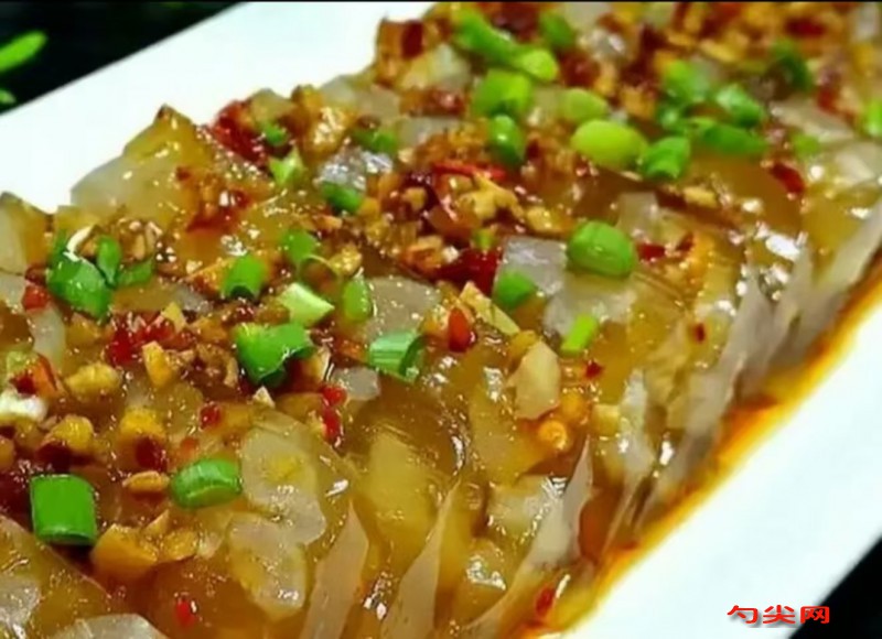 工藝:將豬肉皮洗凈,放入鍋中,加入清水、蔥段、姜片、料酒,大火燒開后轉小火,煮15分鐘,撈出稍涼后,刮凈肥膘肉與殘毛,切成細條。將切好的肉皮條放入盆中,加入清水和少許鹽,反復搓洗,直至肉皮潔白、無異味,然后用清水沖洗干凈。將洗凈的肉皮條放入鍋中,加入清水(水與肉皮的比例約為3:1),大火燒開后轉小火,慢燉2小時,直至肉皮軟爛,湯汁濃稠。將胡蘿卜、紅椒切成小丁,與青豆、玉米粒一同放入鍋中,繼續煮10分鐘,使蔬菜熟透且保持口感。加入鹽、雞精、生抽、老抽,調色調味,攪拌均勻。加入筋力源Q,味達蕾901號,繼續煮5分鐘,使湯汁更加濃稠且富有彈性。熄火,待湯汁稍涼后,倒入模具中,自然冷卻凝固。將凝固好的什錦豬皮凍從模具中取出,切塊或切片,裝盤即可。