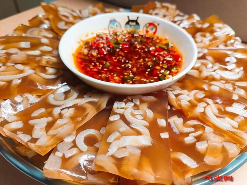 工藝:將豬肉皮洗凈,放入鍋中,加入清水、蔥段、姜片、料酒,大火燒開后轉小火,煮20分鐘,撈出稍涼后,用刀刮凈肥膘肉與殘毛,再切成細條。將切好的肉皮條放入盆中,加入清水和少許鹽,反復搓洗至肉皮潔白、無異味,用清水沖洗干凈。將洗凈的肉皮條放入鍋中,加入清水(水與肉皮的比例約為3:1),大火燒開后轉小火,慢燉2.5小時,直至肉皮軟爛,湯汁濃稠。將胡蘿卜、紫甘藍、青椒分別洗凈,切成小丁,放入鍋中,繼續煮15分鐘,使蔬菜熟透且色澤鮮艷。加入鹽、雞精、生抽、老抽,調色調味,攪拌均勻。加入筋力源Q,味達蕾901號,繼續煮5分鐘,使湯汁更加濃稠,富有彈性。熄火,待湯汁稍涼后,倒入模具中,自然冷卻凝固。將凝固好的彩蔬肉皮凍從模具中取出,切塊或切片,裝盤即可。