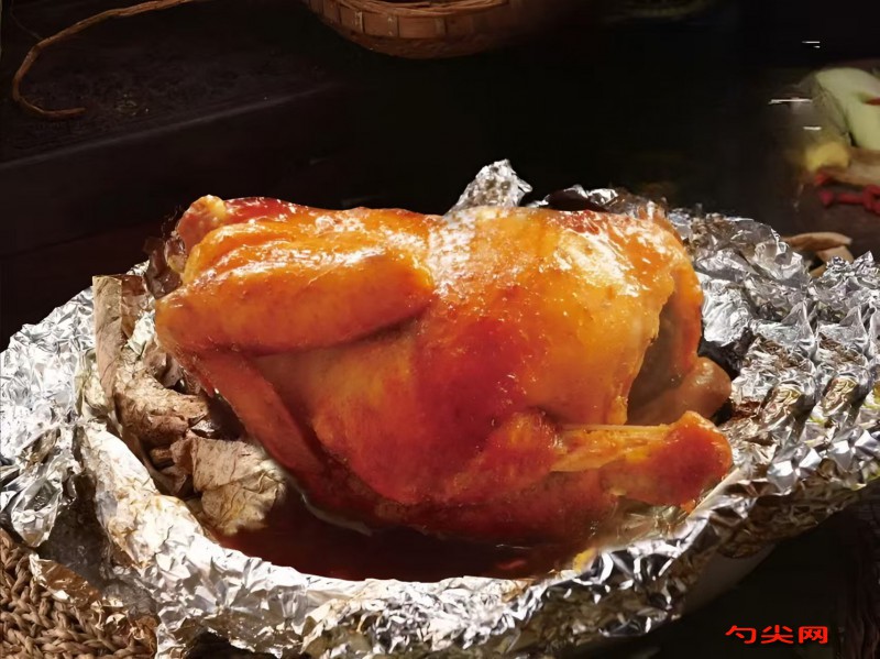 工藝:將雞宰殺后放盡雞血,用60℃左右的熱水浸燙去毛,清洗干凈后切去雞爪,從頸部創口處取出食管、氣管并割斷,然后在腹部開口,掏出內臟并割去肛門,用清水徹底清洗干凈。將富磷聯B12克提前溶解,與味達蕾901號4克,雞粉15克、白糖8克、孜然粉8克、辣椒粉10克、雞精15克、胡椒粉5克、鹽30克、南姜粉10克混合均勻,涂抹在雞肚子里與外側,確保入味。將涂抹好調料的雞用錫紙包裹起來,包兩層以避免漏汁,注意包第三層時雞背向下。在大鍋內放入足夠的鵝卵石,開火加熱15分鐘后關火,先取出約一半的鵝卵石,將包好的雞放入鍋內,再將取出的鵝卵石蓋在雞上,無需開火悶20分鐘即可取出,打開錫紙即可享用。