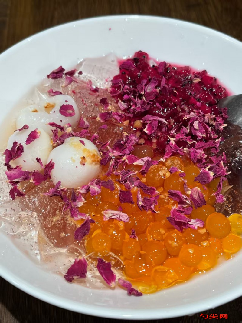 配方:木薯淀粉150克,綠豆淀粉100克,筋力源Q1克,清水1250克,白糖20克,玫瑰花瓣適量(根據口味調整),冰粒、水果粒或堅果適量(作為配料)。