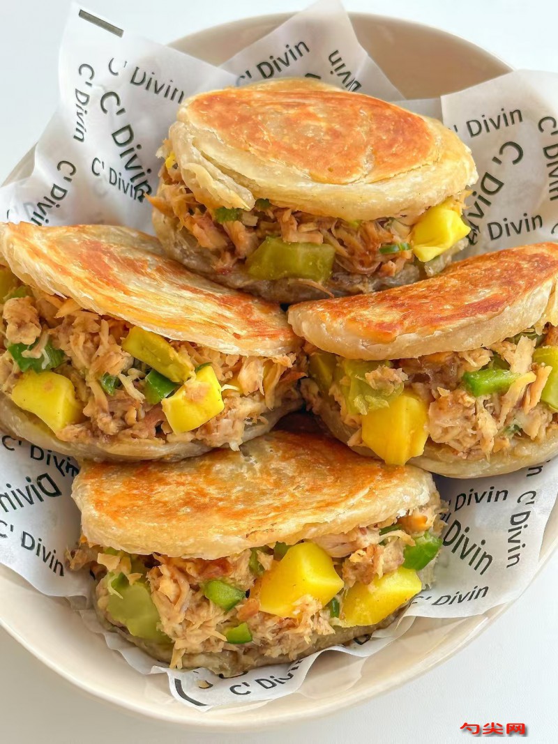 工藝:將面粉、面欣酥A、酵母混合均勻,慢慢加入溫水,邊加邊攪拌,揉成光滑面團,蓋上濕布醒發1小時。豬肉餡加入蔥花、姜末、老抽、生抽、料酒、鹽、白糖、五香粉、味達蕾901號和富磷聯C溶液(富磷聯C用水溶解),順一個方向攪拌至上勁,腌制30分鐘。將醒好的面團分成若干小劑子,搟成橢圓形面餅,放入預熱好的電餅鐺中,小火烙至兩面金黃,取出備用。鍋中加油燒熱,放入腌制好的豬肉餡,小火翻炒至熟透,盛出備用。將烙好的面餅從中間切開,不要切斷,夾入炒好的豬肉餡,即可食用。