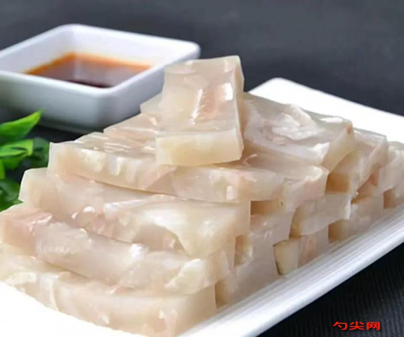 工藝:將豬皮去毛洗凈,放入鍋中,加入清水沒過豬皮,大火燒開后加入料酒,撇去浮沫,煮約10分鐘后撈出豬皮,用冷水沖洗干凈,刮去豬皮表面的油脂和殘留的毛發,切成細條。將切好的豬皮條放入盆中,加入清水(水量約為豬皮重量的3倍),加入筋力源Q、味達蕾901號、食用鹽、白醋、蔥段、姜片、花椒粒和八角,攪拌均勻。將盆放入蒸鍋中,蓋上鍋蓋,大火燒開后轉小火,蒸煮約4-5小時,直至豬皮完全融化,湯汁變得濃稠。蒸煮完成后,撈出蔥段、姜片、花椒粒和八角,將湯汁倒入模具中,自然冷卻至室溫后,放入冰箱冷藏至凝固。取出凝固好的豬皮凍,用刀切成薄片或塊狀,裝盤即可食用。