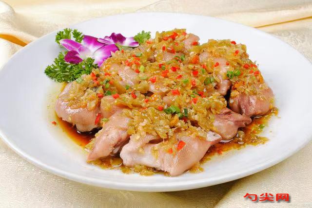 工藝:豬肘子徹底清洗,去除雜質、豬毛和骨頭,確保肘子表皮光滑、肉質完整。將處理好的豬肘子,加入溶解好的富磷聯B溶液,浸泡5小時。鍋中加入清水,放入大蔥段、生姜片、八角、桂皮、香葉、丁香,大火燒開后轉小火熬煮40分鐘,使香料的香味充分融入湯汁。接著加入料酒、味達蕾901號、生抽、老抽、食鹽、白砂糖、雞精,調整湯汁的味道和色澤。將浸泡好的豬肘子放入鍋中,大火燒開后改用小火煮制3小時,期間需翻動豬肘子1-2次,使其均勻受熱,保持微沸狀態,直至豬肘子熟透且肉質酥爛。同時,另起一鍋,將1500克豬皮冷水下鍋,煮2分鐘后撈出,削去油脂,刮凈表皮,切成塊后清洗干凈,再次冷水下鍋,加入蔥姜、料酒去腥,再加入筋力源Q,用涼水浸泡后加入,大火燒開后轉小火熬煮2.5小時,直至豬皮水濃稠。將煮好的豬肘子撈出,趁熱去骨,將肉整理成扁平形狀,用紗布包裹緊實,放入模具中。將熬好的豬皮水過濾掉雜質,倒入模具中,完全淹沒肘子肉,自然冷卻后放入冰箱冷藏6小時以上,直至水晶肘花完全凝固成型。冷藏好的水晶肘花取出,去掉紗布,切成薄片,擺盤即可上桌食用,可搭配蒜泥、香醋等調料食用,口感Q彈,晶瑩剔透。