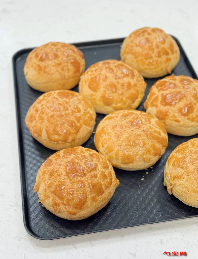 注意事項:揉面過程中,要確保面團揉至能拉出薄膜的擴展階段,這樣菠蘿包才能有良好的發酵和膨脹效果。基礎發酵和最后發酵的時間要根據環境溫度和濕度進行調整,避免過度發酵導致面團塌陷。菠蘿皮的制作要均勻包裹在面團上,避免出現露餡或菠蘿皮過厚的情況。烘烤時間和溫度要根據自己的烤箱特性進行調整,以達到最佳效果。出爐后,菠蘿包需放在冷卻架上冷卻,避免底部變濕。