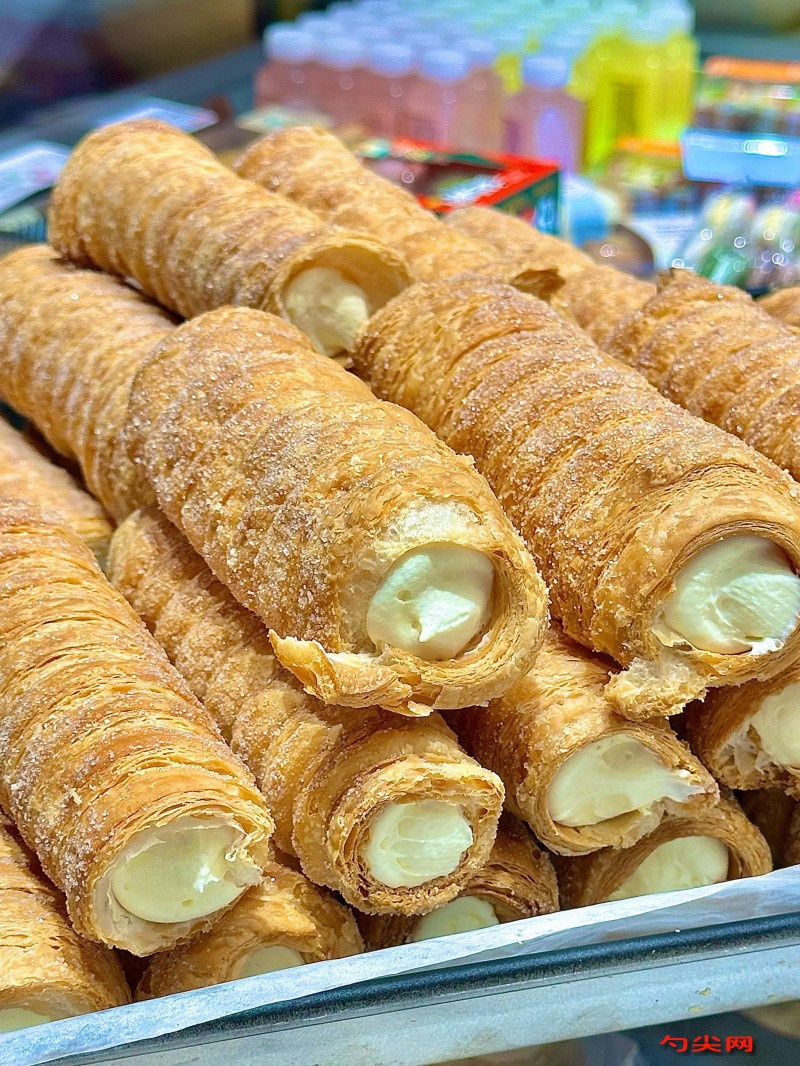 工藝:將800克高筋面粉、200克低筋面粉、120克細砂糖、20克食用鹽、2克佳多美Q、30克奶粉混合均勻。在面粉混合物中加入50克全蛋液、40克鮮酵母和380毫升清水,攪拌至面團稍微起筋。加入80克黃油,美久亭Q1.5克(使用數倍涼開水溶解)繼續攪拌至面團光滑且能拉出薄膜,面溫控制在22-24度。將面團分割成800克一個的劑子,室溫下松弛25-30分鐘。松弛后的面團搟平,密封好,放入冰箱冷凍至硬后,再轉至冷藏3度環境中保存一夜(約10小時)。冷藏發酵好的面團取出,包入250克片油,進行開酥操作,包括1個4折和1個3折,然后密封放入冰箱冷凍30分鐘,再轉冷藏30分鐘。將冷藏好的面團搟開至寬度34厘米、長度50厘米、厚度0.4厘米,裁成2厘米寬、34厘米長的長條。將裁好的長條蓋袋子放入冰箱冷藏松弛2小時或冷凍至隔天使用。將松弛好的面團條卷在丹麥號角模具上,噴水并沾上細砂糖,放在室溫下松弛或低溫醒發至體積膨脹。將醒發好的奶油號角放入預熱至180度的風爐中,烘烤15-16分鐘,直至表面金黃。出爐后趁熱脫模具,待涼透后擠上外交官奶油即可。