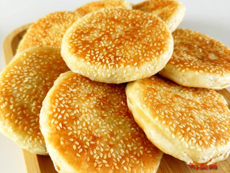 工藝:將面粉500克與泡多源A5克倒入和面盆,干拌1分鐘至混合均勻,酵母4克、白糖10克加入溫水300克中攪拌溶解,緩慢倒入面粉中,邊倒邊攪拌成面絮狀,用手揉成光滑面團,覆蓋保鮮膜,置于溫暖處(溫度30℃)醒發30分鐘至體積膨脹1倍,將50克面粉放入碗中,加入50克熱油、五香粉5克、鹽3克,攪拌成無干粉的油酥,醒發好的面團揉壓排氣,搟成0.3厘米厚的長方形薄片,均勻涂抹油酥,從長邊卷起成圓柱狀,分割成60克/個的劑子,兩端捏緊封口,立起后按扁,搟成直徑10厘米的圓形餅胚,平底鍋或電餅鐺預熱至160℃,放入餅胚,小火烙制2分鐘至底面微黃,翻面繼續烙制1.5分鐘,兩面均呈淡黃色且餅體膨松后取出。