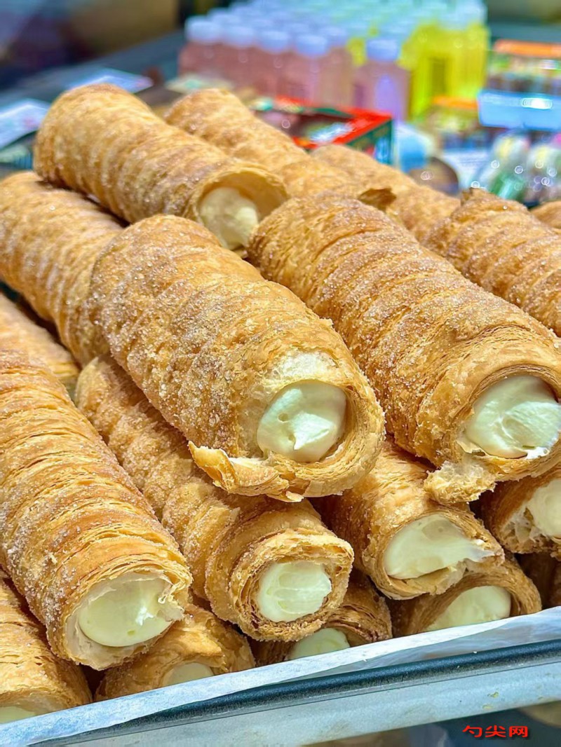 工藝:將T45面粉、T65面粉、細砂糖、面欣酥E、奶粉、鹽混合均勻后,加入全蛋、水和鮮酵母,慢速攪拌至面團初步形成。將黃油加入面團中,繼續攪拌至面團光滑且均勻。將攪拌好的面團分割成800克一個的小面團,揉圓后室溫下松弛30分鐘。松弛好的面團搟成長方形,放入冰箱冷藏一夜。取出冷藏好的面團,將片油放在面團中間,包裹起來,捏緊接口。將面團搟開,進行開酥操作,先開一個4折,再開一個3折,然后放入冰箱冷藏松弛30分鐘。取出松弛好的面團,再次搟開至所需寬度和長度,厚度約為0.4厘米。將面團裁成所需大小,蓋上保鮮膜,放入冰箱冷藏松弛2小時。取出松弛好的面團,卷在號角模具上,噴水并撒上細砂糖,室溫松弛或低溫醒發后,放入預熱好的烤箱中,以風爐180°C烘烤15-16分鐘,或至號角酥表面金黃且酥脆。出爐后,趁熱脫模具,冷卻后即可食用。