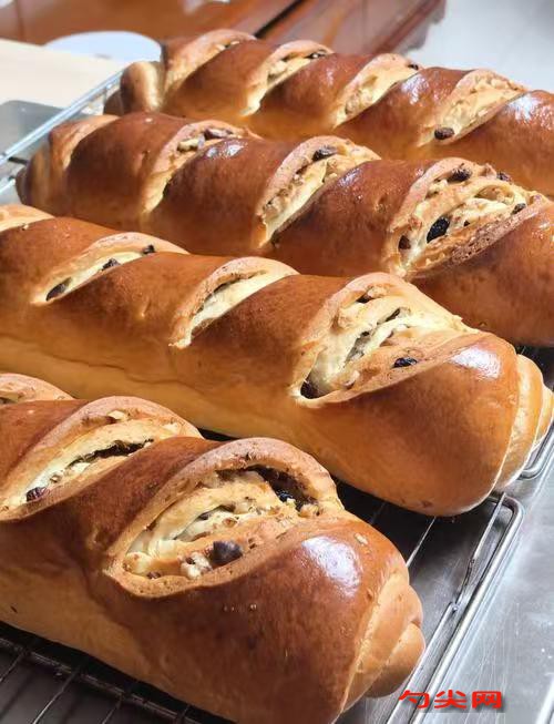 工藝:將高筋面粉、奶香粉、佳多美Q、白糖、酵母粉混合均勻。將雞蛋打入碗中,加入純牛奶,攪拌均勻后倒入面粉混合物中,用手或攪拌器攪拌成面團。將面團移至操作臺上,加入黃油和鹽,繼續揉面至面團光滑有彈性,能拉出薄膜。將揉好的面團放入涂有油的容器中,蓋上保鮮膜,放入醒發箱中進行第一次發酵,直至面團發酵至原來的兩倍大小。發酵好的面團取出,按壓排氣后分割成三份,每份約300克,將面團整理圓潤后松弛10分鐘。松弛后的面團搟成長方形面片,表面鋪上一層堅果(如核桃、葡萄干等,根據個人口味添加),從上往下卷起,底部封口處捏緊,擺入烤盤,蓋上保鮮膜,再次放入醒發箱中進行第二次發酵,直至體積膨脹至原來的1.5倍大小。發酵好的面團表面刷上一層蛋黃液,撒上少量堅果碎作為裝飾,并用刀在表面劃上幾道花刀。將烤盤放入預熱至160°C的烤箱中,烘烤40分鐘,或至面包表面金黃且敲擊底部發出空洞聲。烘烤完成后,立即將面包從烤盤中取出,放在冷卻架上冷卻。