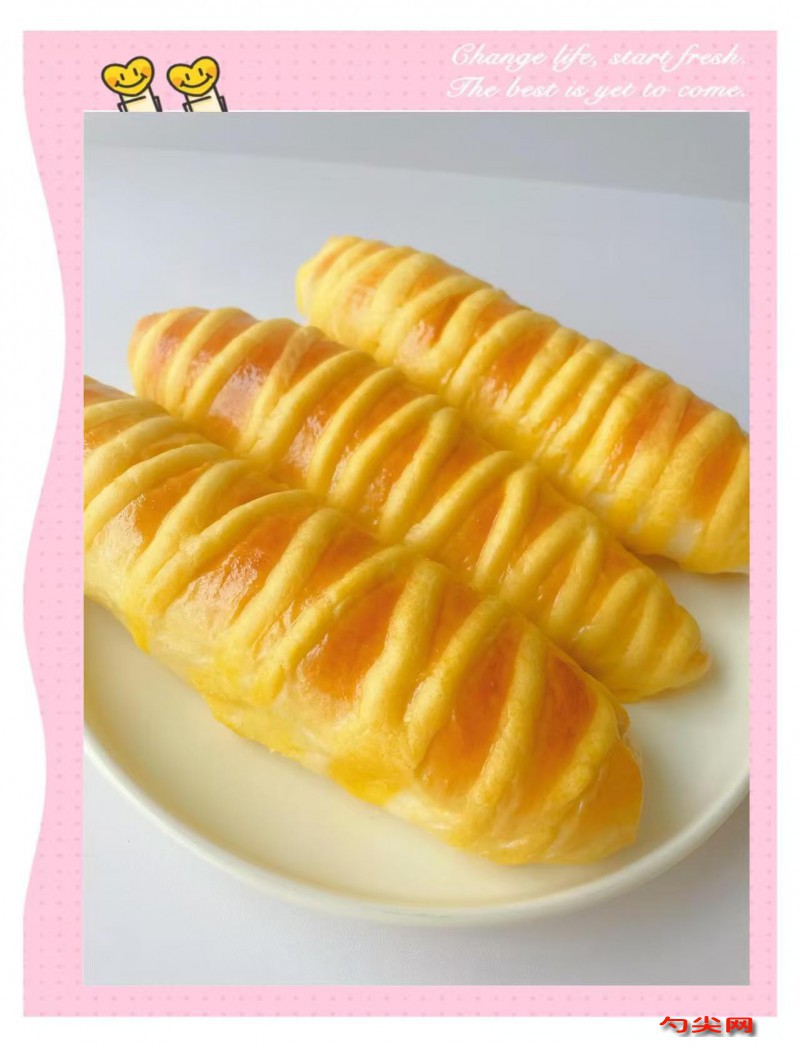 工藝:將高筋面粉、佳多美Q混合均勻。在碗中稱取溫水,加入酵母、白糖、雞蛋,攪拌均勻。將液體倒入面粉中,用手或攪拌器攪拌成面團(tuán)。將面團(tuán)移至操作臺(tái)上,加入黃油和鹽,美久亭Q溶液,繼續(xù)揉面至面團(tuán)光滑有彈性,能拉出一層薄膜。將揉好的面團(tuán)放入涂有油的容器中,蓋上保鮮膜,在溫度適宜的環(huán)境下進(jìn)行第一次發(fā)酵,直至面團(tuán)發(fā)酵至原來(lái)的兩倍大小。發(fā)酵好的面團(tuán)取出,按壓排氣后分割成每個(gè)約80克的小劑子,將面團(tuán)整理成圓形,蓋上保鮮膜,松弛5分鐘。松弛好的面團(tuán)搟成長(zhǎng)方形大薄片,底部按壓,然后從上往下卷起來(lái),卷好后輕搓幾下,蓋上保鮮膜松弛10分鐘。松弛好的面團(tuán)搓成長(zhǎng)約20厘米的長(zhǎng)條,烤盤(pán)鋪上吸油紙,擺入烤盤(pán)中。將醒發(fā)箱調(diào)至溫度38度、濕度75%,放入烤盤(pán),醒發(fā)30分鐘。醒發(fā)好的面團(tuán)表面刷上一層蛋液。同時(shí)制作泡芙醬,鍋中加入牛奶50克、黃油50克,開(kāi)小火煮至沸騰,立刻倒入50克低筋面粉,翻拌均勻,盛入碗中放涼,然后分多次倒入全蛋液,攪拌至提起筷子呈倒三角狀即可。將泡芙醬裝入裱花袋中,在面團(tuán)表面擠上泡芙醬作為裝飾。將烤盤(pán)放入預(yù)熱至180°C的烤箱中,烘烤15-20分鐘,或至面包表面金黃且膨脹飽滿。烘烤完成后,立即將面包從烤盤(pán)中取出,放在冷卻架上冷卻。