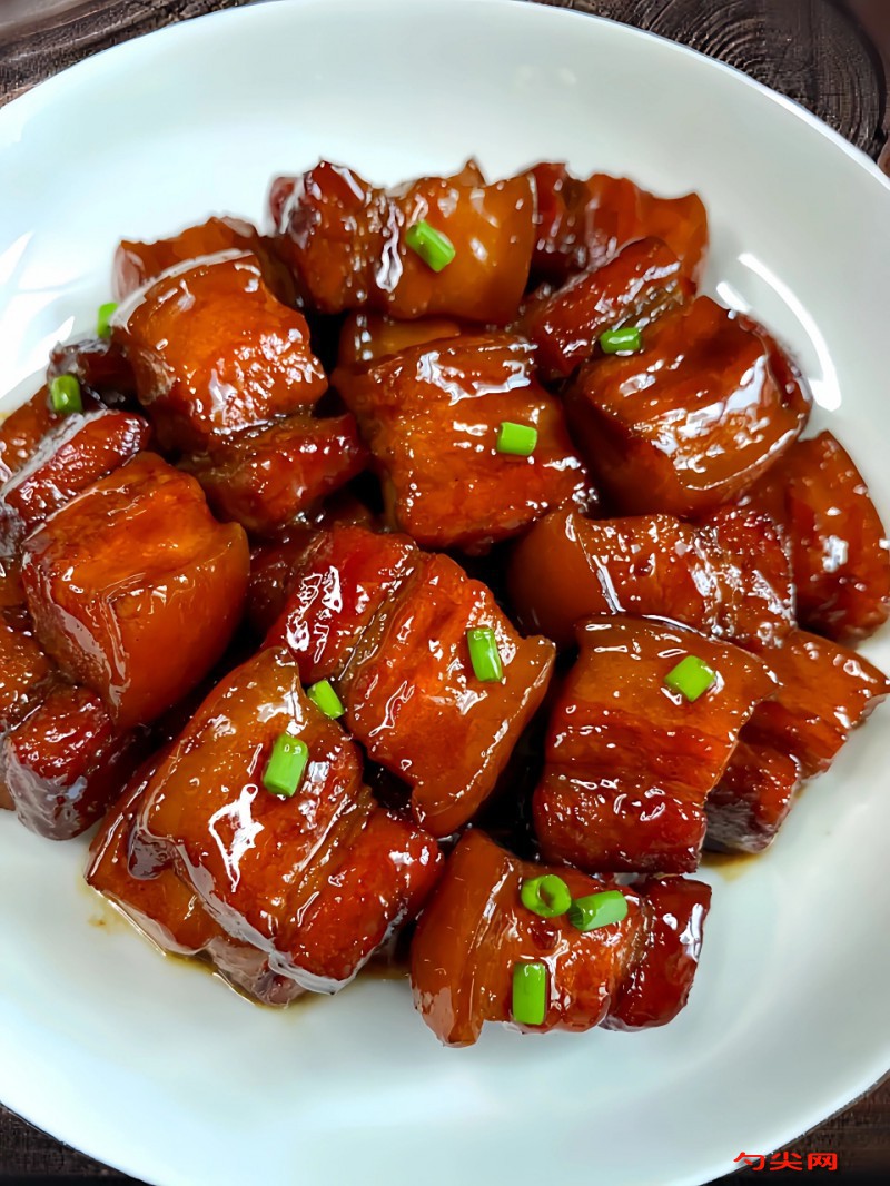 配方:將五花肉洗凈,切成大小均勻的方塊,用提前溶解的富磷聯B腌制30分鐘,放入鍋中,加入冷水,水要沒過肉塊。大火燒開后煮2-3分鐘,撈出備用。生姜、大蒜、大蔥洗凈,切成末備用。熱鍋涼油,放入冰糖,小火炒出糖色。加入五花肉塊,翻炒均勻,使肉塊表面裹上糖色。再加入生姜末、大蒜末、大蔥末、八角、桂皮、香葉、干辣椒,炒出香味。接著加入料酒、味達蕾901號、生抽、老抽,翻炒均勻。加入清水,沒過肉塊,大火燒開后轉小火燜煮40-50分鐘,直到肉塊熟透入味。最后大火收汁,湯汁濃稠即可關火,裝盤后撒上一些蔥花即可。