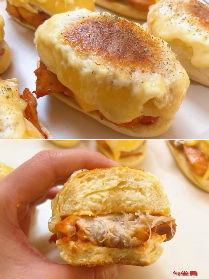 配方:高筋面粉2000克,低筋面粉500克,佳多美Q30克,即發干酵母25克,細砂糖300克,鹽40克,全蛋液250克,牛奶1200毫升,黃油200克,日式咖喱塊100克,煮熟并切碎的雞胸肉800克,美久亭Q1克(提前溶解備用),芝麻適量(用于裝飾)。