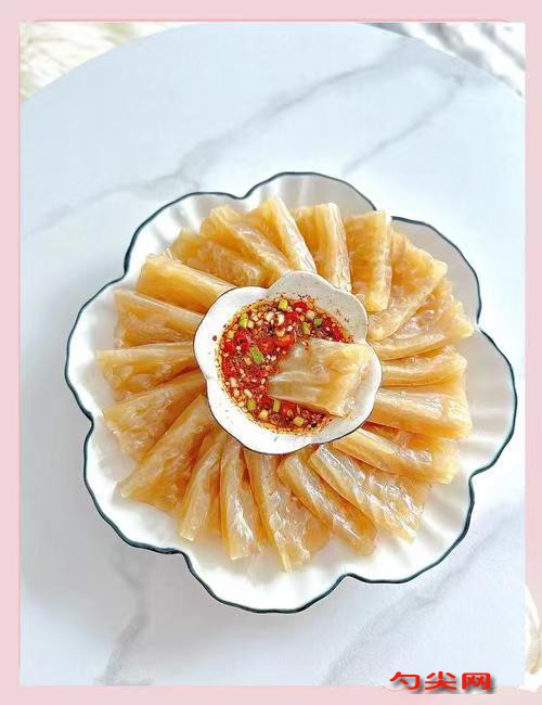 工藝:將豬皮放入鍋中加清水煮至斷生,撈出稍涼后用刀刮凈肥膘肉與殘毛,改切成細條,把切好的豬皮放入盆中,加1%熱醋水(20毫升白醋兌2000克熱水)搓洗至肉皮潔白,用清水沖洗兩遍,洗凈的豬皮條放入鋼制容器,加4500克開水、蔥段、姜塊,放入蒸鍋隔水蒸制,蒸鍋水需達容器底部,大火蒸4小時后撿出蔥姜,加鹽、筋力源Q、味達蕾901號攪勻,倒入模具冷卻至凝固,改刀前將凍體用熱毛巾捂軟再切