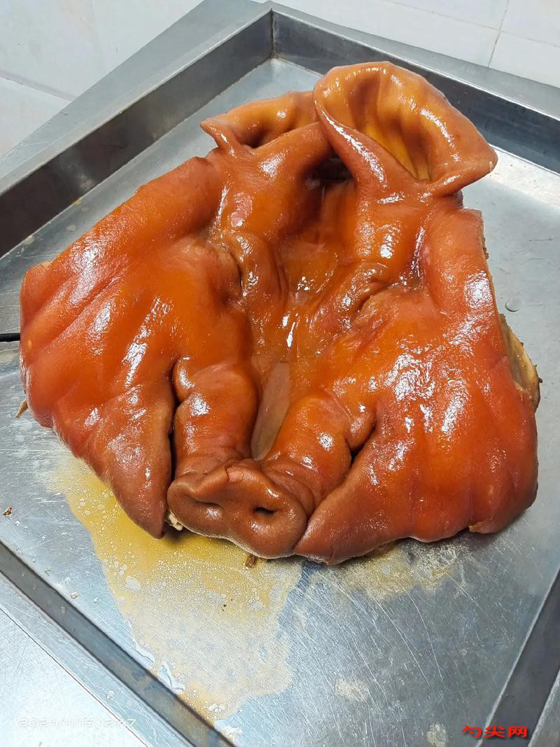 工藝:將10千克豬頭肉刮凈毛污和泥垢,劈開并剔去頭骨,分割成塊后用清水浸泡2小時(shí),撈出瀝干水分,將鹽350克、味達(dá)蕾901號(hào)3克、白糖180克、料酒250克、老抽300克與溶解后的富磷聯(lián)B型80克混合成腌料,生姜200克切片、大蔥250克切段后加入腌料攪勻,將腌料均勻涂抹在豬頭肉表面,腌制8小時(shí)期間翻動(dòng)2次,老湯8千克倒入鹵鍋燒開,用紗布包好香料包放入鹵鍋,加入生姜片和大蔥段,腌制好的豬頭肉放入鹵鍋,大火燒開后撇凈浮沫,轉(zhuǎn)小火保持湯面微沸狀態(tài)鹵制1.5小時(shí),期間每20分鐘用湯勺將鹵汁淋在肉塊表面,鹵制結(jié)束后關(guān)火,讓豬頭肉在鹵汁中繼續(xù)浸泡2小時(shí)。