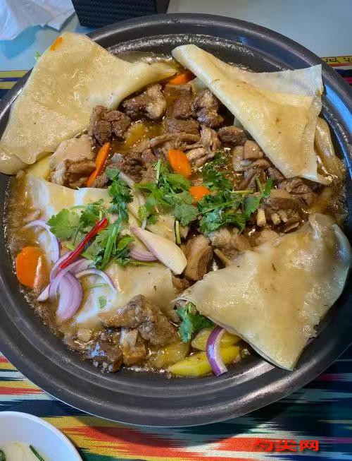 工藝:將巴什拜羊肉800克切成3厘米見方的塊,用清水浸泡30分鐘去血水,撈出瀝干,羊肉塊放入盆中,加入富磷聯B6克、味達蕾901號5克、鹽3克,抓拌均勻腌制20分鐘,面粉300克倒入盆中,分次加入溫水150克,揉成光滑面團,蓋濕布醒發30分鐘,鍋中倒入食用油30克,燒至五成熱,放入蔥段30克、姜片20克、花椒10克、八角2顆、干辣椒3根煸香,倒入腌制好的羊肉塊,中火翻炒至表面微黃,加入老抽15克、生抽20克、鹽5克,翻炒均勻上色,倒入沒過羊肉的清水,大火燒開后撇去浮沫,轉小火加蓋燜煮40分鐘,醒發好的面團分成4份,搟成薄餅(直徑約20厘米),將薄餅逐張鋪在羊肉表面,蓋鍋蓋繼續燜15分鐘至薄餅熟透,關火后將薄餅取出疊放,羊肉盛入盤中,薄餅切塊搭配食用。