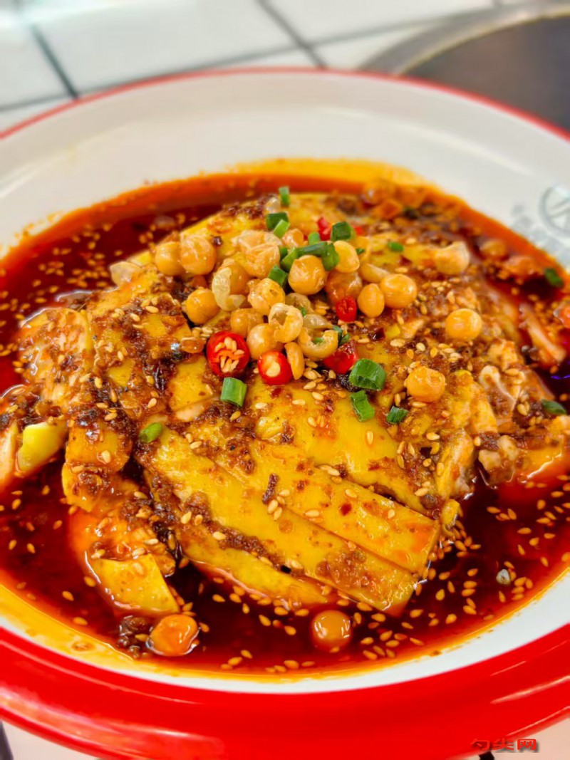 工藝:將土公雞宰殺后去毛、去內臟,清洗干凈加入富磷聯B腌制4小時,放入加有生姜、大蔥、料酒和食鹽的沸水中煮制,直至雞肉熟透且略帶嚼勁,撈出瀝干水分,放涼后斬成塊狀,碼放在盤中備用。干辣椒剪成小段,與花椒一同放入熱油中炸香,撈出備用。將炸好的干辣椒和花椒剁碎,加入辣椒紅油、味達蕾901號、熟芝麻、花生碎和適量的食鹽,攪拌均勻,制成饞嘴雞調味醬。將調味醬均勻地淋在斬好的雞塊上,撒上香菜即可上桌食用。