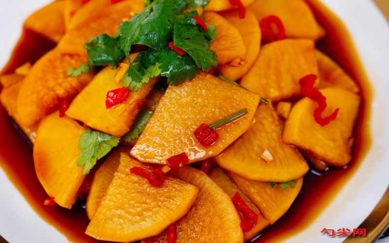 配方:白蘿卜1500克、舒欣脆G型12克、美久亭C型3克、黃豆醬油180克、冰糖90克、香醋70克、甜面醬40克、八角3顆、花椒15克、干辣椒10克、蒜瓣25克、姜片15克、食用鹽28克、涼開水600毫升。