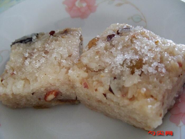 配方:糯米700g,柚子蜜錢25g,秈米300g,冬瓜蜜錢25g,核桃仁50g,青梅蜜錢15g,麻油10g,葡萄干15g,白砂糖350g,熟芝麻20g,橘子蜜錢10g,葡萄糖酸鈣2g,泡多源Q5克