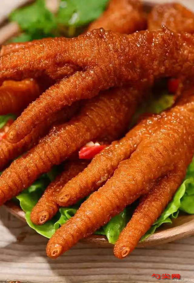 工藝:大雞爪2500克放入清水中浸泡出血水后控干,溫水1500克中加泡多源Q30克溶解,再加白醋100克、麥芽糖100克攪勻,放入雞爪浸泡3.5小時后撈出控干,鍋中加植物油500克燒至八成熱,下雞爪炸制20秒后攪散防黏,炸至上色出現褶皺撈出,放入溫水淹沒浸泡30分鐘以上,干辣椒節100克、干青花椒30克、干花椒30克、白芷25克、桂皮10克、八角10克、黃梔子10克、小茴香10克、白蔻5克、香葉2克溫水泡10分鐘撈出,鍋中加底油燒熱,下郫縣豆瓣醬100克、辣妹子100克炒香,加姜片100克、蔥段80克、大蒜瓣80克炒出味,加生抽70克、白糖40克、食鹽30克、雞汁30克、高度白酒20克、味達蕾901號6克攪勻,加清水沒過雞爪,放入香料包大火燒開,轉中火煮20分鐘,關火浸泡15分鐘