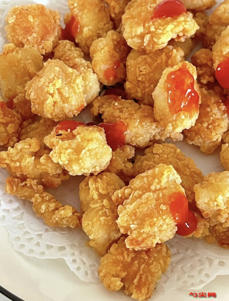 工藝:將雞胸肉5000克洗凈后切成1.5厘米見方的塊狀,富磷聯B18克、泡多源E15克、用40℃溫水120克溶解后加入雞塊抓拌均勻,冷藏腌制2小時,低筋面粉400克、玉米淀粉250克混合過篩,加入面欣酥F5克、食鹽45克、辣椒粉15克、黑胡椒粉10克、蒜粉8克、洋蔥粉5克攪拌均勻,雞蛋4個打散后與姜汁15克、蔥汁15克、料酒20克、剩余清水130克混合倒入粉料中攪拌成面糊,將腌制好的雞塊瀝干水分后倒入面糊中抓拌均勻,使每塊雞肉均勻裹糊,鍋中倒入植物油加熱至170℃,逐塊放入雞塊炸制2.5分鐘至淺黃色撈出,油溫升至190℃后復炸40秒至金黃色撈出控油