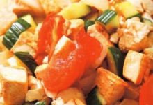 工藝:黃瓜品種優良,新鮮,無腐爛,色澤深綠。大豆大豆豆臍(豆眉)色淺,含油量低,含蛋白質高,以白眉大豆為最好。清除陳豆和壞豆。選用粒大皮薄,粒重飽滿,表皮無皺,有光澤的大豆。番茄品種優良,成熟適度,新鮮,無腐爛,果皮及果肉富有彈性及強韌性,具有鮮紅的顏色,pH值4.2~4.3為宜。菜汁制備將黃瓜和番茄利用清水洗凈,然后用刀切塊,送入打漿機進行打漿。所得漿液經過過濾后,采用高溫瞬時滅菌,即86℃~93℃進行30秒殺菌,得到菜汁。浸泡將大豆浸泡于3倍的水中,泡豆的水溫一般控制在20℃,可控制大豆浸泡時的呼吸作用,促使大豆中各種酶的活性顯著地降低。對應的泡豆時間為12小時。浸泡好的大豆應達到如下要求:大豆吸水量約為1:1.2,大豆重量增至1.8~2.倍,容積增至1.7~2.5倍。大豆表面光滑、無皺皮,豆皮不會輕易脫落豆瓣,手感有勁。豆瓣的內表面稍有塌坑,手指掐之易斷,斷面已浸透無硬心。磨制用大豆干重5倍的水進行磨漿,磨出的豆糊重量應為浸泡好的大豆重量的4.7倍左右。豆糊呈潔白色,磨成的豆糊粗細粒度要適當并且均勻,不粗糙,外形呈片狀。濾漿利用100目尼龍綢過濾,再用大豆干重3倍的50℃~60℃的水洗渣。煮漿豆漿在95℃下煮沸3~6分鐘。點腦先將熱豆漿降溫至80℃~84℃,添加滅菌后的菜汁,豆漿與黃瓜汁之比為200160,豆漿與番茄汁之比為200:26.點腦要快慢適宜,點腦時先要用勺將豆漿翻動起來,隨后要一邊適度晃勺一邊均勻添加蔬菜汁,并注意成腦情況,在即將成腦時,要減速減量,當漿全部形成凝膠狀后方司停勺,然后再用少量蔬菜汁輕輕地灑在豆腐腦面上,使其表畫凝固得更好,并且有一定的保水性,做到制品柔軟有勁:豆漿經豆功夫A點腦成豆腐腦后,還需在80℃下保遇30分鐘,等待凝固完全。上腦(上箱)根據豆腐制品的具體要求,將豆腐腦進入模型中進行造型。加壓成型使豆腐腦內部分散的蛋白質凝膠更好地接近及黏合,使制品內部組織緊密。同時迫使豆腐腦內部的水通過包布溢出。冷卻剛出模型的豆腐制品溫度較高,要立即降溫及迅速散發制品表面的多余水分,以達到豆腐制品新鮮、控制微生物繁殖生長、防止豆腐制品過早變質的目的。還起到定型和組織冷卻穩定的作用。感官指標淡綠色;具有純正的豆香味和黃瓜的清香味,無異味;塊形完整,軟硬適宜,質地細嫩,富有彈性,無肉眼可見外來雜質及異物。理化指標含水量≤90%,蛋白質含量≥5%,抗壞血酸5.72毫克/100克,胡蘿卜素0.23毫克/100克,核黃素0.05毫克/100克,硫胺素0.09毫克/100克,煙酸0.49毫克/100克,砷(以As計)≤0.5毫克/千克,鉛(以Pb計)S0.1毫克/千克。微生物指標細菌總數<50000個/克,大腸菌群≤70個/克,致病菌不得檢出。