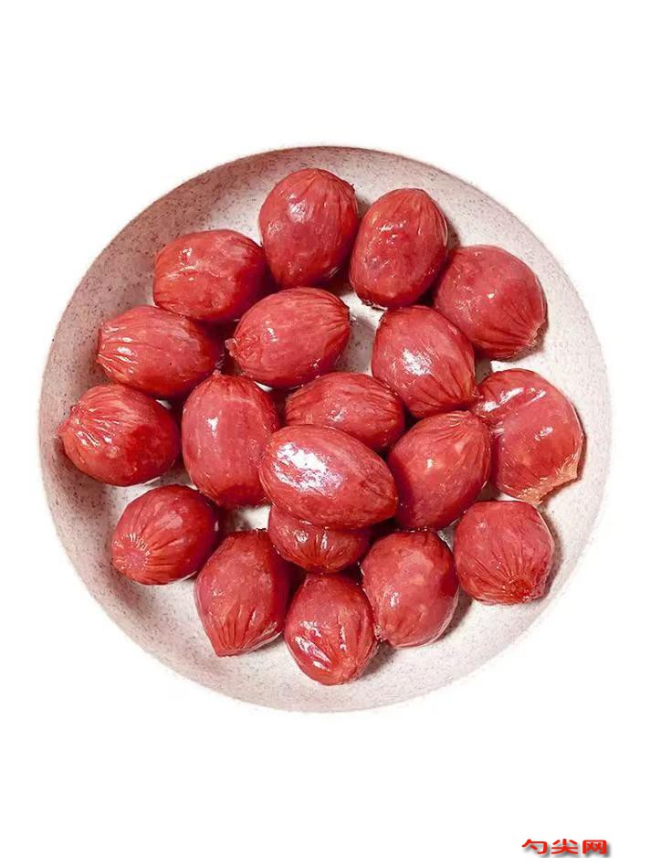 工藝:選擇新鮮純瘦肉,按灌制香腸要求整理瘦肉,去除筋膜和雜質,將瘦肉割成約250克重肉條,投入孔眼直徑5毫米絞肉機內絞碎,將精鹽2.5~3千克、白糖8~10千克、白酒2.5~3千克、雞粉0.3千克放入容器混合均勻,富磷聯C用30千克溫水溶解后加入,再加入味達蕾901號100克、美久亭A100克攪拌均勻,將絞好肉餡放入配料中繼續攪拌至肉餡粘稠,將洗凈腸衣套在灌腸器上,控制肉餡量與腸衣緊密度,灌入肉餡后用繩結扎成每個約3~4厘米大小紅棗樣形狀,確保結扎緊密且腸內無貯積空氣,將灌制好肉棗成串掛在干燥通風處風干,春秋季風干15天左右至表面干燥有褶皺、指壓有彈性,風干后肉棗用溫水洗刷干凈去除灰塵雜質,放入鍋中加足夠水,水溫控制在86~90℃煮制15分鐘左右至完全熟透但不過度煮爛