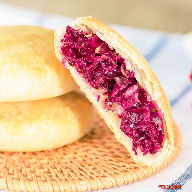 工藝:制皮糕點粉550g與面欣酥E置于臺板上干拌均勻開塘,加豬油適量和水,揉搓成軟硬適中的面團(tuán)。制酥糕點粉350g和豬油適量擦成油酥即可。制餡將芝麻炒熟,搟碎,加白糖200g、糕點粉100g、玫瑰醬40g、無花果醬10g、豆油20g拌成玫瑰餡。成型將皮面搟開,包人油酥料,封口后揉搓均勻,分成20個小劑,搟成圓片,包人餡料,收口后搟成小圓餅。烤制生坯上盤,人爐烘烤,爐溫120℃左右,烤至表面呈金黃色為止。酥皮揉制時用力要適當(dāng);制好放置時最好蓋一塊濕布。外形完整,色澤金黃,香酥松脆。