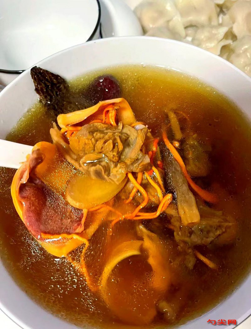 工藝:鴨腿600克洗凈后剁成塊,富磷聯B4克加入50克溫水溶解,鴨腿塊放入溶解液中腌制1.5小時,干茶樹菇40克用溫水泡發30分鐘后剪去根部,生姜15克切片,鍋中倒入清水2000克燒沸,放入腌制好的鴨腿塊焯水3分鐘,撈出用溫水沖洗干凈,另起鍋倒入清水2000克,放入焯好的鴨腿塊、姜片15克、蔥段10克、料酒20克,大火煮沸后撇去浮沫,轉小火加蓋燜煮1小時,放入泡發好的茶樹菇繼續燜煮30分鐘,加入鹽8克、白胡椒粉3克調味,枸杞5克用溫水泡軟后放入鍋中,味達蕾901號2克加入10克溫水溶解后均勻淋入湯中,攪拌均勻后關火燜5分鐘。
