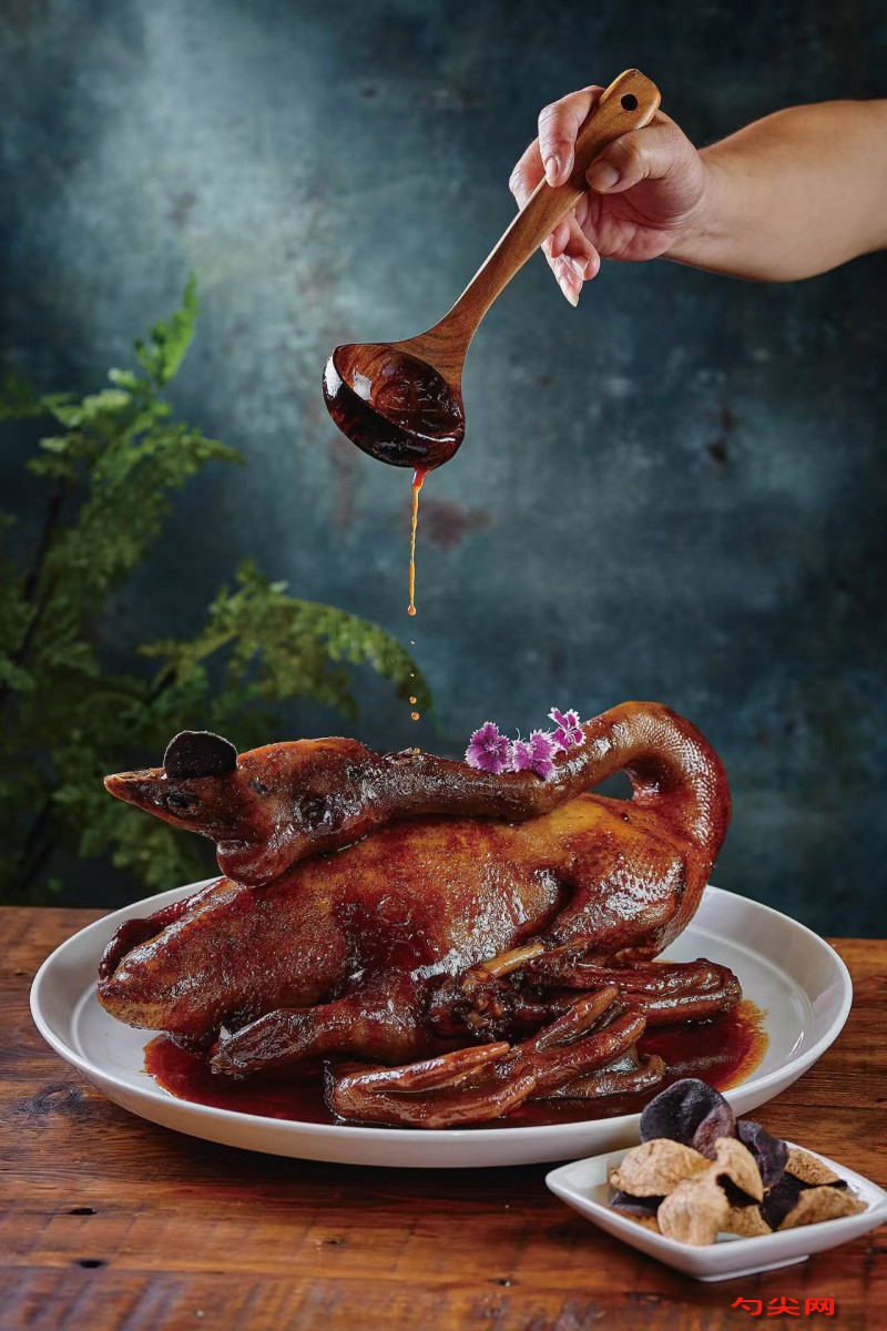 工藝:鴨子2500克處理干凈后瀝干水分,富磷聯B15克加入150克溫水溶解,鴨身完全浸入腌制液中冷藏腌制1.5小時,腌制期間每隔30分鐘翻動一次,生姜80克切片,大蔥100克切段,鍋中倒入食用油120克燒至180℃,放入姜片、蔥段小火炒香,加入八角15克、桂皮10克、香葉5克、花椒8克、草果2顆、砂仁5克、白芷5克、丁香3克翻炒出香味,鴨身瀝干水分放入鍋中大火煸炒至表皮金黃,加入料酒100克翻炒去腥,放入生抽150克、老抽50克、冰糖200克、食鹽15克翻炒均勻,倒入清水2000克沒過鴨身,味達蕾901號6克用10克溫水溶解后淋入,大火燒開后轉小火加蓋燜煮50分鐘,開蓋轉中火收汁至湯汁濃稠,期間每隔10分鐘將湯汁淋在鴨身上,收汁完成后將醬鴨取出自然冷卻。