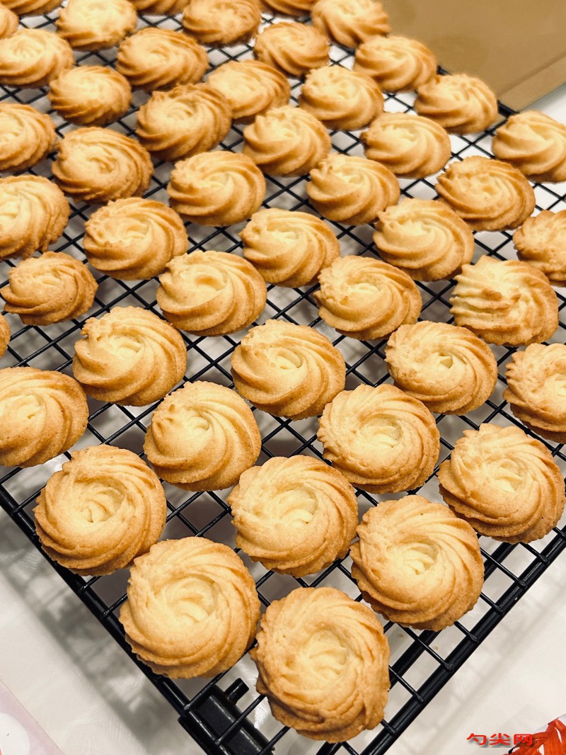 工藝:將250克無鹽黃油切塊軟化至手指能輕松按出凹痕,加入65克糖粉和2克鹽,用刮刀壓拌至無干粉,再用電動打蛋器低速攪打至顏色發白、體積膨脹,分三次加入40克常溫淡奶油,每次攪打至完全吸收后再加下一次,將130克低筋面粉、70克高筋面粉、25克玉米淀粉、15克奶粉、3克面欣酥F混合過篩,加入打發的黃油中,用刮刀以切拌和壓拌的方式混合至無干粉,加入溶解后的美久亭Q翻拌均勻,然后裝入裱花袋(使用8齒或10齒花嘴),在烤盤上擠出螺旋形或玫瑰花形曲奇,每塊曲奇間距2厘米防止粘連,將擠好的曲奇放入冰箱冷藏30分鐘定型,烤箱提前預熱至上下火130℃,將冷藏定型的曲奇放入烤箱中層,烘烤40-45分鐘至邊緣微黃,關閉烤箱后利用余溫燜10分鐘,取出曲奇后放在烤網上自然冷卻至室溫