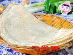 工藝:將高筋面粉、木薯淀粉、筋力源R和食鹽混合均勻,放入盆中。將雞蛋打入混合好的面粉中,加入溫水,邊加邊攪拌,直至攪成面絮狀。然后,用手將面絮揉成光滑的面團,蓋上濕布或保鮮膜,靜止醒發(fā)30至50分鐘。醒發(fā)好的面團取出,放在案板上揉光,然后揪成小劑子,每個小劑子約50克。將小劑子搟成薄餅狀,盡量搟得薄而均勻。預(yù)熱電餅鐺或平底鍋,將搟好的薄餅放入,烙至兩面金黃,餅皮熟透即可取出。