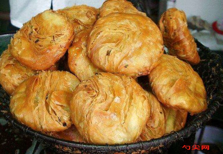 工藝:制餡將牛肉洗凈,切成末,加菜油40g,川鹽、大蒜米、花椒面、生姜米、蔥白(切成蔥花)適量調拌均勻成餡。包餡成型以三成燙面、七成生面加生酥10g、菜油5g揉和均勻,搓成長條,切成5小段,每段壓成13cm長的條形,包人余酥,搟長卷攏,再切成兩段,每段搟平包人餡心,圍攏按扁制成圓餅。將余下的菜油205g倒入平鍋內,燒至三成熱時,分別把餅放入油鍋內,用微火使餅慢慢進油,然后逐步加大火候,餅浮起后要兩面翻炸,炸10~15min,待表面呈金黃色時起鍋。鮮香焦脆,金黃透亮,味美可口。