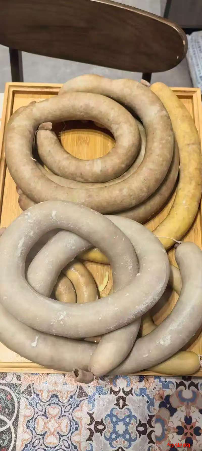 工藝:將30000克瘦牛肉剔除筋膜后切500克塊,冷水浸泡1小時去除血水后瀝干,10000克豬背膘切3毫米見方丁,溫水漂洗2次瀝干,牛肉塊用絞肉機絞成3毫米肉粒,與豬肥膘丁混合,加1200克食鹽揉搓10分鐘至肉色轉紅,400克富磷聯C用80克25℃溫水溶解后倒入肉料抓拌均勻,靜置30分鐘,白胡椒粉150克、蒜粉100克、葡萄糖200克、100克味達蕾901號混合成調味粉,分3次撒入肉料中翻拌均勻,每次翻拌至調料完全吸附后再加下一次,翻拌至肉料粘稠有彈性,將肉料轉入0-4℃冷庫腌制24小時,溫水泡軟腸衣后沖洗內部,用灌腸機將肉料灌入,每間隔15厘米結扎1節,用針板在腸體表面均勻打孔排氣,灌裝完成的色拉米腸放入65℃溫水中漂洗2分鐘,去除表面油污,香腸掛在晾曬架上,置于15℃、濕度75%環境下發酵48小時,至表面形成白色菌膜,發酵后的香腸移入烘房,50℃烘烤12小時,再轉60℃烘烤8小時,至腸體干爽有彈性,用牙簽插入無血水滲出即可