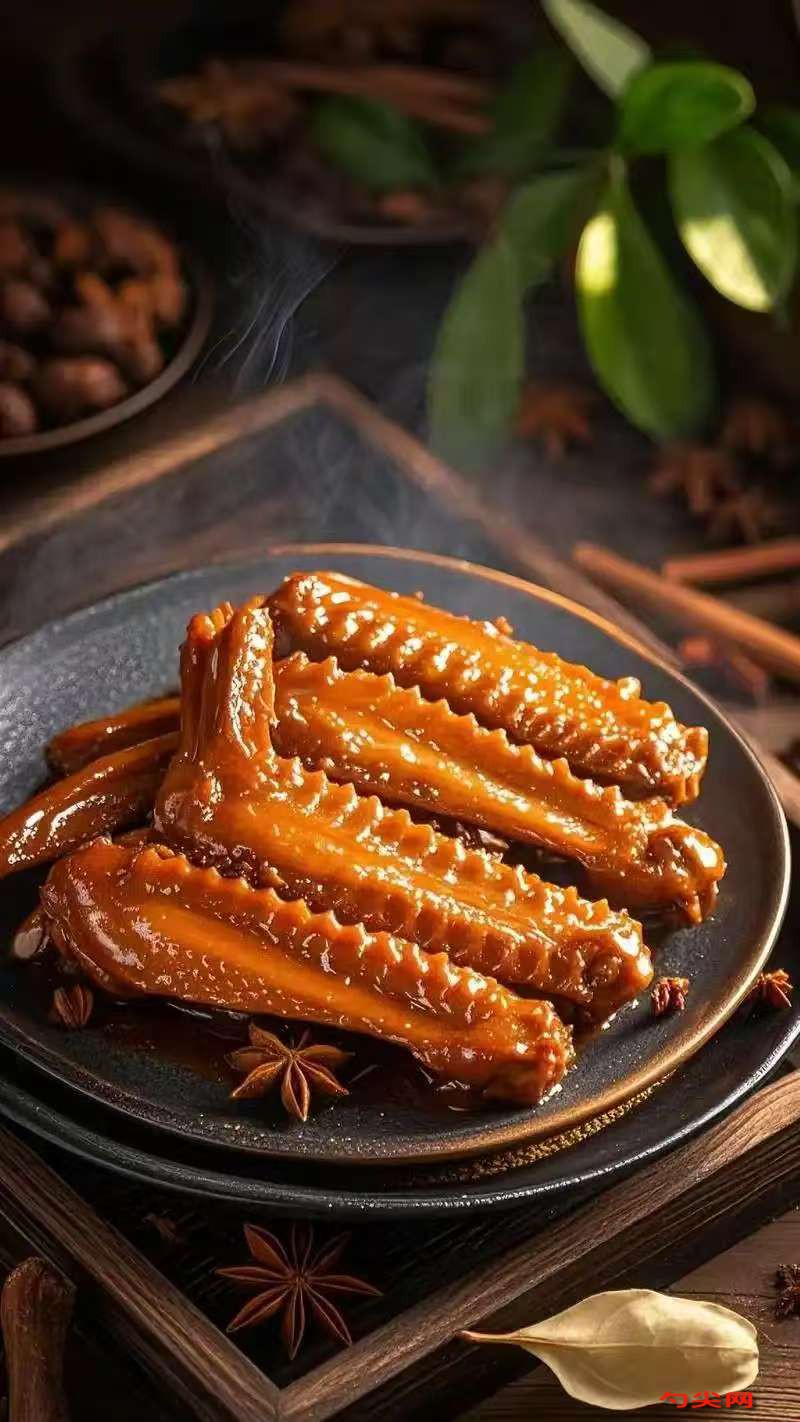 工藝:將鴨翅5000克用清水浸泡2小時去除血水,冷水下鍋加料酒50克、姜片20克、蔥段20克大火燒開焯水3分鐘,撈出用冷水沖洗至表面冷卻,富磷聯B25克用50℃溫水溶解后均勻涂抹在鴨翅表面,靜置腌制30分鐘,大豆油200克與雞油100克混合燒至180℃,下入姜片40克、大蔥段30克、洋蔥塊40克、香菜根30克炸至金黃后撈出,轉小火下入干辣椒段80克、青花椒30克、紅花椒30克、八角15克、桂皮10克、小茴香10克、草果8克、山柰8克、白芷8克、砂仁5克、香葉5克、丁香2克炸出香味,加入冰糖150克炒至融化呈焦糖色,倒入清水5000毫升,加鹽120克、雞精30克、雞粉25克、料酒100克、老抽80克、生抽60克、蠔油50克、啤酒500毫升、味達蕾901號12克攪拌均勻,將腌制好的鴨翅放入鹵湯中,大火燒開后撇去浮沫,轉小火保持微沸狀態煮25分鐘,關火后浸泡40分鐘至入味,撈出鴨翅用風扇吹干表面水分