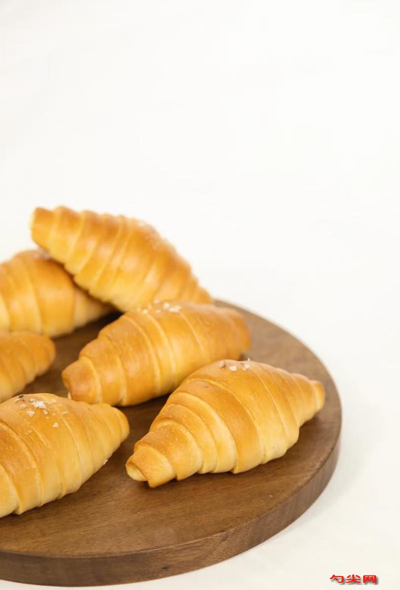 工藝:將高筋面粉500克、低筋面粉100克、細(xì)砂糖25克、海鹽5克、酵母粉5克、佳多美Q2克倒入廚師機攪拌缸混合均勻,加入淡奶油60克、牛奶220克低速攪拌成團,轉(zhuǎn)中速揉至表面光滑,加入無鹽黃油30克,美久亭Q溶液繼續(xù)揉至完全擴展階段,面團溫度控制在26℃以內(nèi),將揉好的面團滾圓放入發(fā)酵箱,溫度28℃、濕度75%發(fā)酵至2倍大,發(fā)酵好的面團分割為50克/個,滾圓后松弛15分鐘,將松弛好的面團搟成橢圓形,翻面后整理成長方形,底部壓薄,將有鹽黃油100克切成10克/塊的小塊,取一塊放在面團頂部,自上而下卷起成水滴形,接口處捏緊,將卷好的面團放入烤盤,表面噴水后撒上海鹽3克,放入發(fā)酵箱溫度32℃、濕度80%發(fā)酵至1.5倍大,表面刷全蛋液,放入預(yù)熱好的烤箱上火200℃、下火180℃烘烤12分鐘,至表面金黃出爐