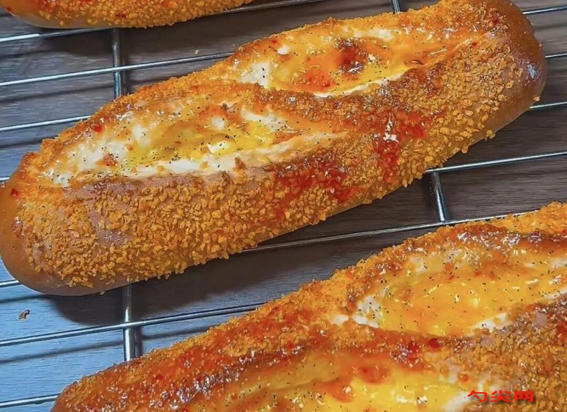 工藝流程:蜂蜜芥末醬制作:蜂蜜芥末醬所有材料混合均勻即可。雞蛋芥末醬制作:熟雞店搗碎,加入酸黃瓜醬和蜂蜜芥末醬一起拌勻,將切達(dá)黃芝士片切絲和馬蘇里拉芝士碎倒入一起拌均勻即可。主面團制作:1、將干性稱重倒入攪拌缸,慢速攪拌均勻,下入濕料材料慢速攪拌,快速打到七-八成筋度加入魯邦種慢速攪拌均勻,九成筋下入軟化的黃油慢速攪拌吸收,快速攪拌至完全擴展。2、起缸面團折疊整理光面,溫度32度濕度70%基礎(chǔ)醒發(fā)50分鐘左右。3、基礎(chǔ)醒發(fā)好的面團分割成100g/個,排氣收圓蓋膜松弛20分鐘。4、松弛好的面團搟面杖從中間部位上下?lián){壓成長條狀,翻面整理平整,芝士片對半切開,擺三片芝士片打底,擠上一條雞蛋芥末醬,蓋一片培根肉,兩頭面團向中間折疊,兩邊面團收口捏緊,整形成長條狀,噴少許水粘上面包糠整齊擺盤進(jìn)行最終醒發(fā)。5、醒發(fā)箱溫度32度/濕度80%,醒發(fā)時間30-40分鐘,劃刀口兩道進(jìn)爐烘烤。6、烤爐提前預(yù)熱,烘烤溫度上火210度/下火180度,3秒整齊烘烤時間12-14分鐘左右,出爐輕整盤趁熱刷泰式甜椒醬(可已直接購買成品)即可。