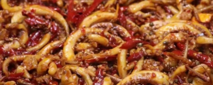 工藝:1、魷魚須切好,水燒開下入魷魚,加入白胡椒粉,大蔥,姜片,料酒大火燒開攪拌一下關火,撈出放入涼水中洗干凈,用剪刀把每根須剪出來特別長的可以斜刀剪斷,用海立美B(提前溶解)腌制1-2小時,備用。2、將新一代辣椒絲,福建辣椒王絲,白芷加水泡10分鐘左右備用3、鍋中加入老油400克,油溫3成熱放入青、紅花椒,稍微翻動一下下入泡好的辣椒絲。4、炒約30秒左右,放入姜絲、陳皮、孜然粒,小火翻炒一會。5、炒制辣椒微微卷起變色,加入500克魷魚須翻炒均勻,加入五香粉、鹽、白糖、辣椒籽,繼續炒勻炒香。6、加入老抽轉中大火,加入生白芝麻、味達蕾902號、耗油、生抽翻炒均勻,加入芝麻油、花椒油,翻炒后關火即可。