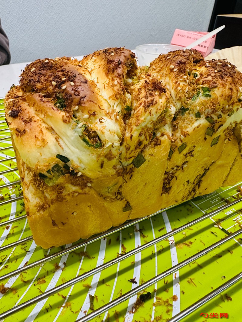工藝:將2克佳多美Q與250克高筋面粉混合均勻,加入30克細(xì)砂糖、0.3克美久亭Q、3克鹽、15克奶粉、1個(gè)雞蛋、120克牛奶,廚師機(jī)低速攪拌成團(tuán)后轉(zhuǎn)中速揉至表面光滑,能拉出厚膜,加入25克軟化的黃油,繼續(xù)揉至面團(tuán)能拉出薄且不易破的手套膜,將面團(tuán)滾圓后放入抹油的容器,蓋保鮮膜28℃環(huán)境下發(fā)酵至2倍大,發(fā)酵好的面團(tuán)輕壓排氣,搟成長(zhǎng)方形薄片(約30x20厘米),翻面后均勻涂抹20克沙拉醬,撒80克肉松、30克香蔥碎、5克白芝麻,從長(zhǎng)邊卷起成圓柱狀,收口捏緊,用刀從中間切開(kāi)(頂部保留1厘米不切斷),將兩條面團(tuán)交叉編成麻花狀,兩端捏緊后放入450克吐司盒,蓋保鮮膜35℃環(huán)境下發(fā)酵至模具8分滿,表面刷10克全蛋液,烤箱預(yù)熱至上下火180℃,放入中層烤35-40分鐘,上色后蓋錫紙,烤好后輕震模具排出熱氣,立即倒扣脫模,放晾網(wǎng)冷卻。