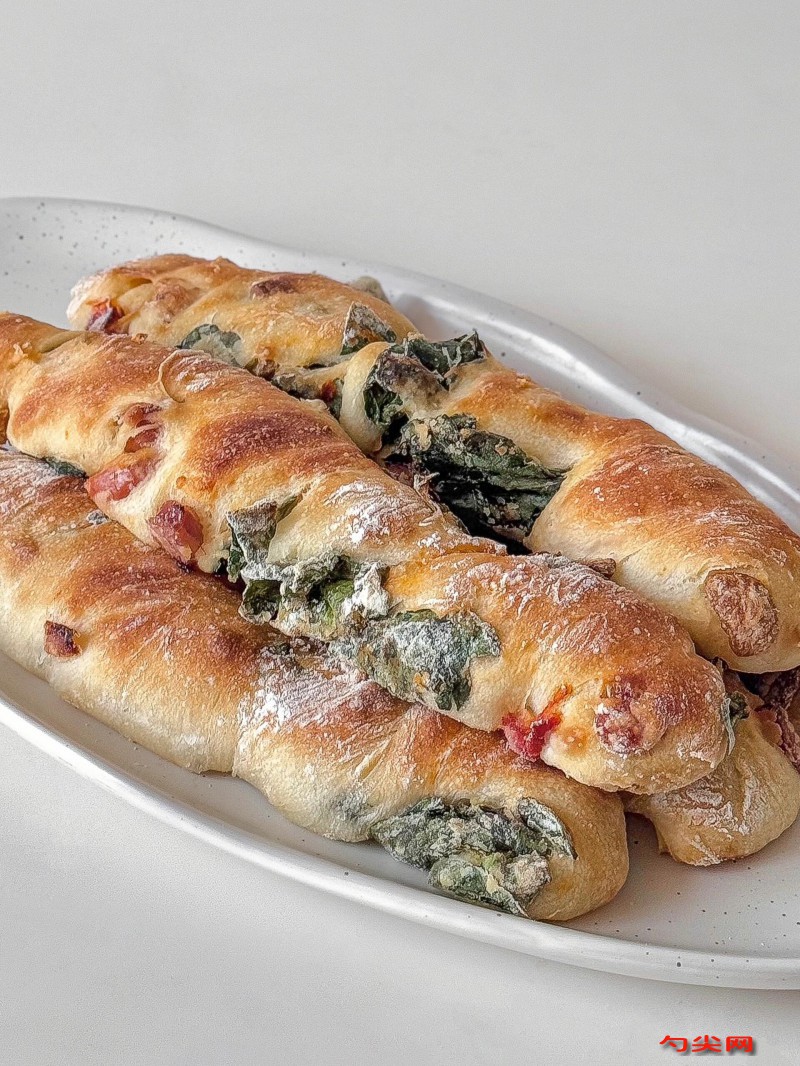 工藝:美久亭Q型用數倍涼開水溶解備用,將360克溫水加熱至約37°C,加入4克耐高糖酵母攪拌均勻靜置5-10分鐘至出現泡沫,在一個大碗中混合300克高筋粉、4克佳多美Q型、100克全麥粉和6克鹽,將激活好的酵母水倒入干性材料中,加入20克植物油和溶解后的美久亭Q型水溶液,開始揉面,可用廚師機或手工揉制,揉至面團光滑有彈性,將切碎的新鮮香菜葉加入面團繼續揉至均勻分布,將揉好的面團放入涂抹少許油的碗中,用保鮮膜覆蓋放在溫暖處發酵至面團體積翻倍,在面團發酵同時準備好250克切成小塊的醬牛肉,取出發酵好的面團輕柔分成等份,在面團中間加入醬牛肉塊和適量奶酪片,將面團輕輕包裹住牛肉和奶酪,將整形好的面團放在鋪有烘焙紙的烤盤上再次發酵至體積明顯增大,預熱烤箱至200°C,在面團表面輕輕刷一層水或蛋液,將烤盤放入預熱好的烤箱中烘烤大約25-30分鐘至面包表面金黃,出爐后讓恰巴塔在烤架上完全冷卻。