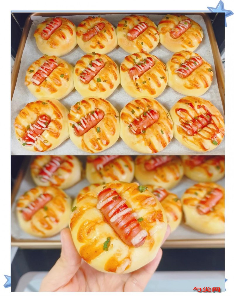 工藝:將3克佳多美Q型與500克高筋面粉干拌均勻,5克酵母粉用少量溫牛奶溶解,50克白砂糖、5克鹽加入200克牛奶中攪拌至融化,把溶解后的酵母水和牛奶糖鹽水倒入混合好的面粉中,再加入1個雞蛋,攪拌成面絮后開始揉面,揉至面團稍具筋性時加入40克黃油,繼續(xù)揉面至能拉出薄膜的擴展階段,將1.5克美久亭Q型用數(shù)倍涼開水溶解后均勻倒入面團中,揉勻,把面團整理好密封,放入醒發(fā)箱,溫度38度,濕度75,醒發(fā)至兩倍大,將醒發(fā)好的面團放在案板上揉壓排氣,分成大小均勻的12個劑子,每個劑子約80克,將劑子滾圓,蓋上保鮮膜松弛15分鐘,取一個松弛好的劑子,搟成橢圓形,從上往下卷起來,搓成長條,將長條繞在香腸上,兩端捏緊,放在烤盤上,將烤盤放入醒發(fā)箱,溫度38度,濕度75,再次醒發(fā)至1.5倍大,在醒發(fā)好的腸仔包表面刷一層全蛋液,擠上適量番茄醬和沙拉醬,撒上蔥花,將烤箱提前預(yù)熱至180度,放入烤盤,烤15-20分鐘,至表面金黃即可出爐。