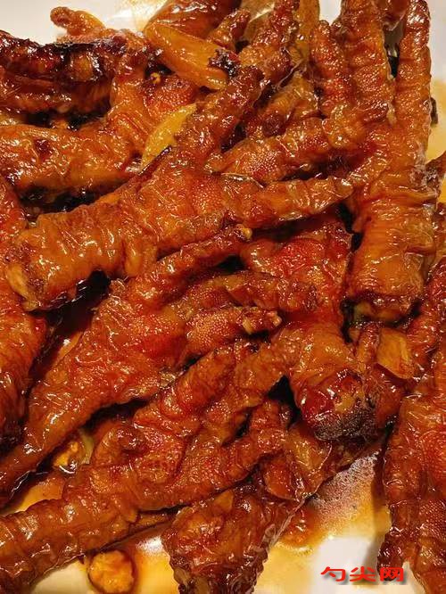 工藝:選擇2500克大雞爪放入清水中浸泡出血水后撈出控干水分,盆中加入3750克溫水放入泡多源Q型75克提前溶解再加入白醋100克和麥芽糖100克充分攪拌稀釋后下入控干水分的雞爪浸泡3-5小時后撈出控干水分,鍋中加入500克植物油油溫8成熱后下入雞爪炸至雞爪上色且出現褶皺后撈出放入盆中加入適量溫水淹沒浸泡30分鐘以上后撈出,把干辣椒節100克,干青花椒30克,干花椒30克,白芷25克,桂皮10克,八角10克,黃梔子10克,小茴香10克,白蔻5克,香葉2克用溫水浸泡10分鐘后撈出控干水分,鍋中加入適量植物油先下入姜片100克,蔥段80克和大蒜瓣80克炒出香味后再下入郫縣豆瓣醬100克和辣妹子100克炒出紅油后下入控干水分的香料炒至香料無水分后下入適量高湯或清水大火燒開后煮15分鐘以上待香味出來后下入雞爪再放入生抽70克,白糖40克,食鹽30克,雞汁30克,高度白酒20克和味達蕾901號6克再次燒開后小火煮40分鐘關火浸泡3小時后大火收汁即可。