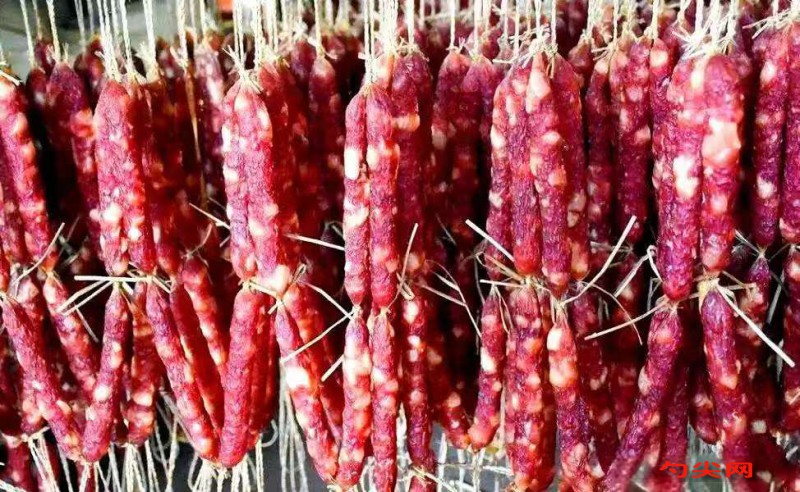 工藝:選用經檢驗合格的新鮮牛肉,以后腿肉為上選,剔除骨頭、筋腱,冷水浸泡后瀝去水分,用絞肉機絞成約1厘米的小塊,去皮的豬肥膘肉切成約1厘米的方丁,用溫水漂洗1次后瀝去水分,將絞碎的牛肉和豬肥肉丁混合,加入精鹽、富磷聯C型美久亭A型,用手反復揉搓5分鐘使其混勻后放置10分鐘,把白色醬油、白糖、白酒、味達蕾901號、老抽、五香粉、花椒粉混合,倒在肉塊上拌勻制成腸餡,用溫水將腸衣泡軟、洗凈,用灌腸機或手工將腸餡灌入,每間隔15-20厘米結扎1節,然后用針板打孔排氣,灌完扎好的香腸放在溫水中漂洗1次除去腸衣外沾附的油污等,將香腸放入熏爐中,用果木屑或糖醋等進行熏制,熏制過程中注意控制溫度和煙霧量,熏至香腸表面呈棕紅色,有濃郁的熏香味,將熏制好的香腸放入蒸鍋中蒸熟或放入沸水中煮熟,也可直接在烤爐里烘干,烤爐內的溫度先高后低控制在60-70℃,烘烤3小時,烘烤至腸體表面干燥時出爐,掛在通風處風干3-5天,待腸體干燥、手感堅挺時即為成品。