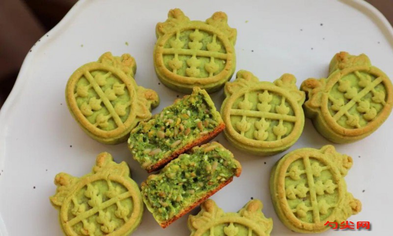 工藝流程:餅皮:玉米油、細砂糖、糖漿、全蛋液混合攪拌至乳化(無油星),加入開心果醬拌勻。粉類(高筋面粉+低筋面粉+佳多美Q型+美久亭Q型)提前混合過篩,加入液體中翻拌成團,調整至耳垂般柔軟度,蓋保鮮膜冷藏松弛2小時。所有餡料材料混合揉搓成團,分割為30g/個,搓圓備用。餅皮分割為20g/個,壓扁后包入餡料,收口捏緊,用模具壓出花紋。烤箱預熱至180°C,上下火中層烤15分鐘,表面微黃即可。