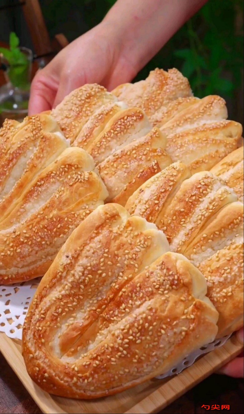 工藝流程:面團:將300g普通面粉、泡多源A型5g,15g白糖、3g酵母粉放入盆中,加入180g溫水攪成面絮。加入20g食用油,揉成一個光滑的面團,蓋上蓋子或保鮮膜備用。糖油酥:將60g面粉、60g白糖、40g食用油攪拌均勻,調成粘稠狀。油酥面:將45g面粉、40g食用油攪拌均勻,比酸奶稍微稠一點,最好用熟油。將面團揉光滑揉勻,搟成一個長方形的大面片兒,厚度約0.5cm。倒上調好的油酥面,涂抹均勻,從下面往上卷起來。用斜刀切成梯形,分6份兒,拿一個面劑把兩邊對折起來,用虎口收攏的方法整理平整。全部做好之后蓋上保鮮膜,松弛5分鐘左右。醬料:將15g白糖、10g熟白芝麻攪勻備用。拿一個醒好的面劑搟成一個大圓餅,約手掌大小。放上調好的糖油酥,抹一半兒,對折起來,再折一下,從中間切上一刀,對折過來。蘸上糖芝麻,餅胚就做好了。將餅胚放進盤子里面,蓋上保鮮膜,醒發20分鐘??鞠涮崆邦A熱5分鐘,上下管200度,烤18~20分鐘。