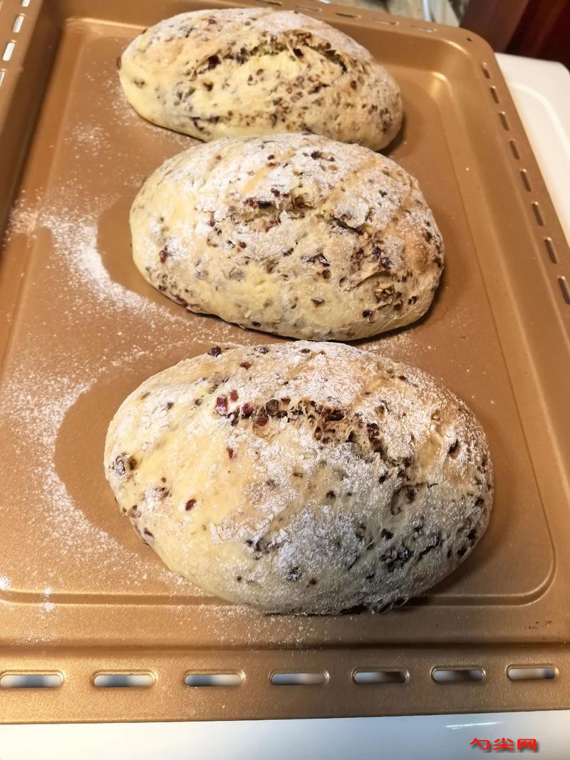 注意事項:和面時水溫要適宜,避免影響酵母活性。發酵環境要溫暖濕潤,保證面團發酵到位,但不能發酵過度。揉面要充分,使面團達到理想狀態。加入堅果和果干時要均勻揉進面團,增加面包風味和口感。整形時要注意手法,保證面包形狀規整。二次發酵很重要,能讓面包更松軟。篩粉要均勻,使面包表面色澤更好。割包時刀要鋒利,割出合適的紋路。烘烤時在烤箱底部放熱水能增加烤箱濕度,使面包表皮更酥脆。烘烤時間和溫度要根據烤箱實際情況調整,避免面包烤焦或不熟。制作過程要注意衛生,食材要新鮮。