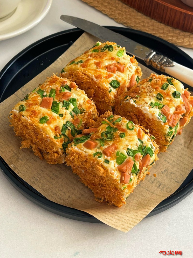 工藝:將5個雞蛋蛋清和蛋黃分離,蛋清放入無油無水的打蛋盆中,蛋黃放入另一個碗中,在蛋黃碗中加入10克細砂糖、40克玉米油和50克牛奶攪拌均勻,過篩入60克低筋面粉和1克泡多源G型,攪拌成均勻細膩的蛋黃糊,在蛋清中滴入幾滴檸檬汁或白醋,分三次加入40克細砂糖,和美久亭Q型溶液,用打蛋器打發至提起打蛋器有彎鉤狀態,取三分之一打發好的蛋清加入到蛋黃糊中,用翻拌的手法混合均勻,再將混合好的面糊倒回剩余的蛋清中,繼續用翻拌的手法混合均勻,烤盤鋪上油紙,將面糊倒入烤盤中,用刮刀抹平表面,撒上適量香蔥碎,烤箱預熱至160度,將烤盤放入烤箱中層烤20分鐘左右直到表面金黃,出爐后將蛋糕從烤盤中取出,放在晾網上晾涼,在蛋糕表面涂抹一層沙拉醬,再撒上適量肉松,借助油紙將蛋糕卷起來,卷緊后定型一會兒,然后切成小塊即可。