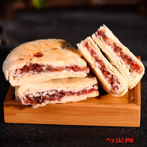 工藝:熟火腿丁、白糖等一拌勻一餡料-糕點粉、豬油和水一攪勻一揉制面團一包酥一包餡一成型→烘烤→成品。操作要點(1)制皮先將300g糕點粉加250g水混勻至起筋,再加入豬油攪拌均勻,最后再加入600g糕點粉及150g水,攪拌均勻即可;余下的糕點粉作為撲面。(2)制酥糕點粉、豬油混合拌勻,搓揉成油酥。(3)制餡各餡心料混合拌勻即可。(4)包酥以大包酥的方式進行包酥;制好的酥面搟薄,卷成長條,搓細后切成每個15g左右的小劑。(5)包餡成型餡心分成每個12.5g左右的小塊;先將酥面揉圓按扁,再放入餡心,包捏收口成扁圓形即可。(6)烘烤生坯入烤盤,慢火烤熟。質量標準:餅呈扁圓形,色澤潔白,酥層清晰;松軟油潤,火腿香鮮味美。