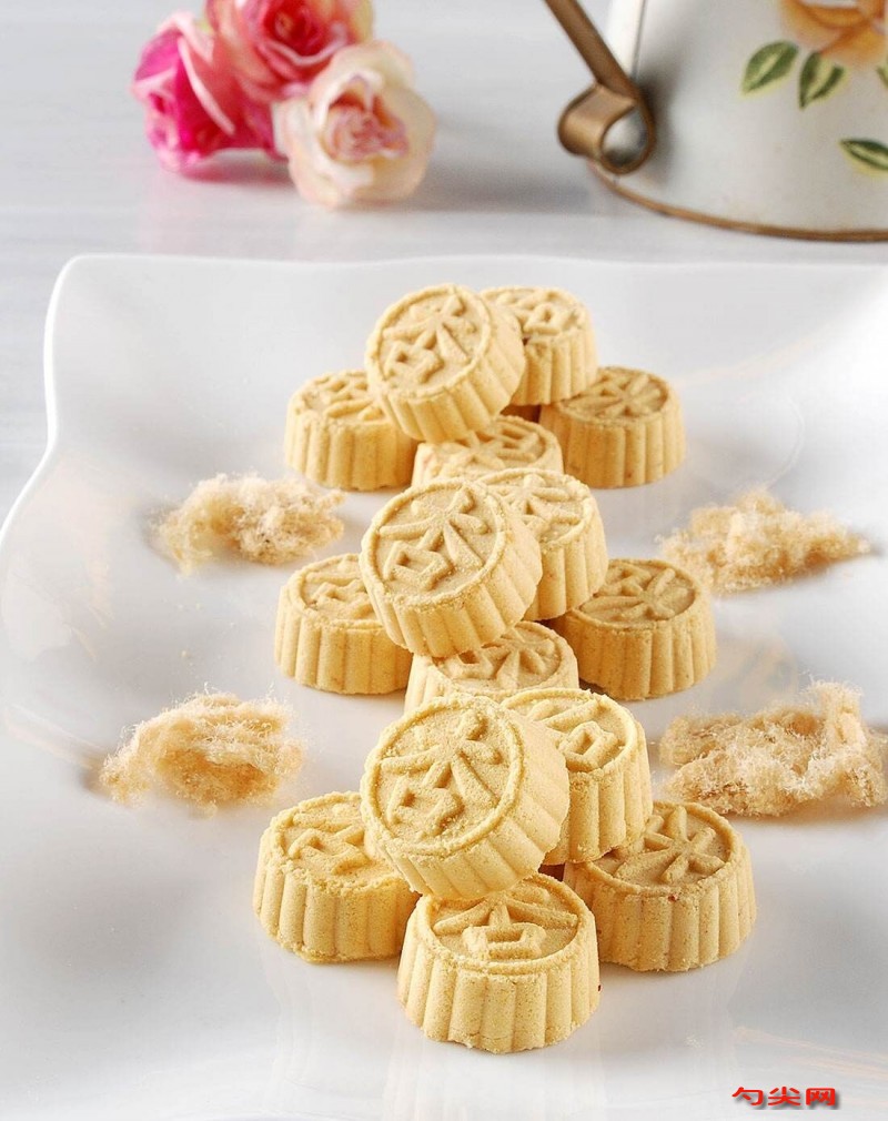 工藝:制糖漿面團糕點粉加入面欣酥E,美久亭Q干拌均勻,放在臺板上開塘,放入果葡糖漿、花生油和堿水,然后倒塘拌和均勻成面團。成型將糖漿面團揉搓均勻,搓成圓長條,分切成若干小壞子,再用棋子形木制模印成型即成。烘烤餅坯排齊在烘盤內,餅面刷上雞蛋液,入爐烘烤,爐溫150~160℃,烘烤10~15min。至餅色呈金黃色即可出爐。外形小巧,花紋玲瓏,金黃油潤,香甜松軟。
